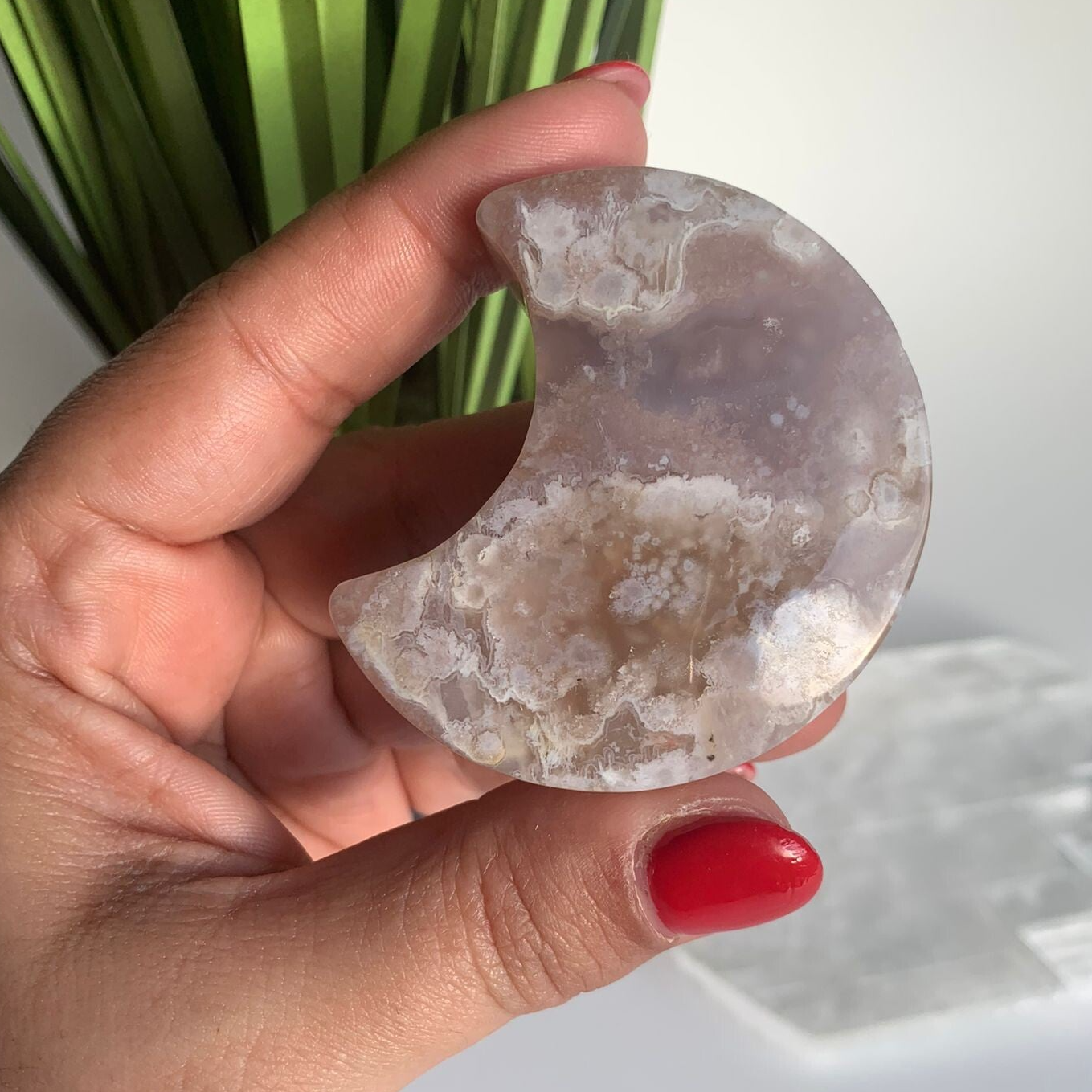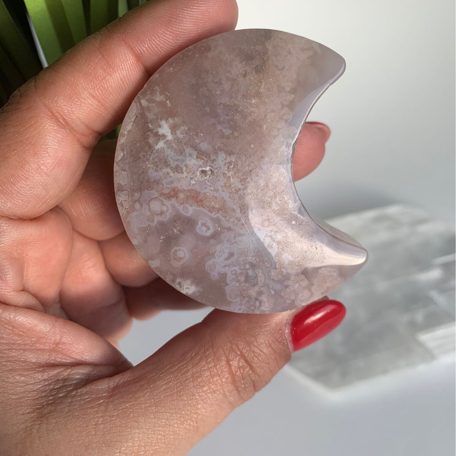 Whether used for meditation, as a decorative centerpiece, or as a thoughtful gift, this flower agate moon carving radiates positivity and beauty, reminding you to bloom wherever you are.