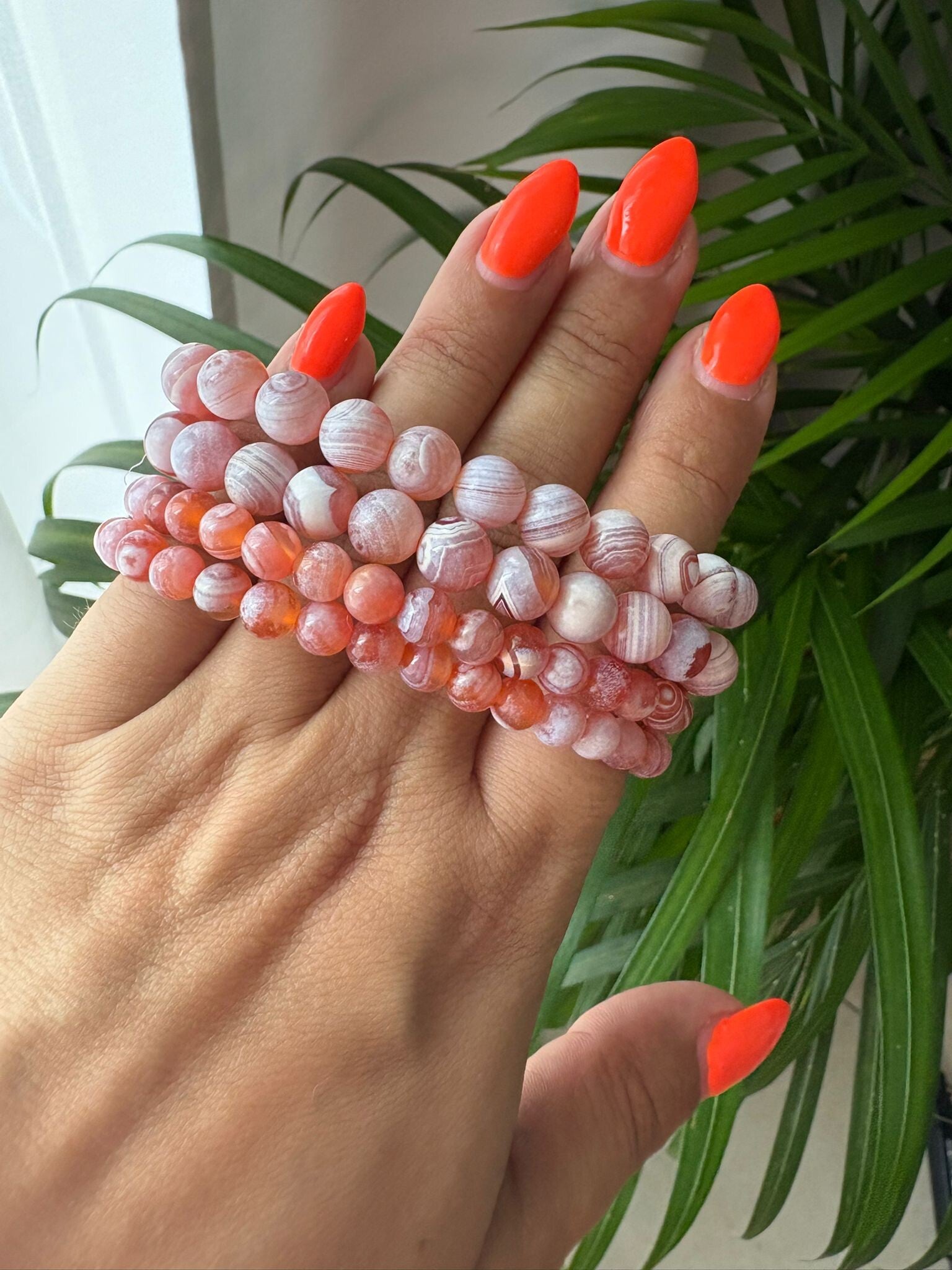 Like flowing water, these stunning banded agate beads reveal their hidden depths when wet shifting from soft pastel pinks to rich, vivid corals. Each bead is a tiny universe of swirling lines and calming energy, reminding you that transformation is a natural part of life.