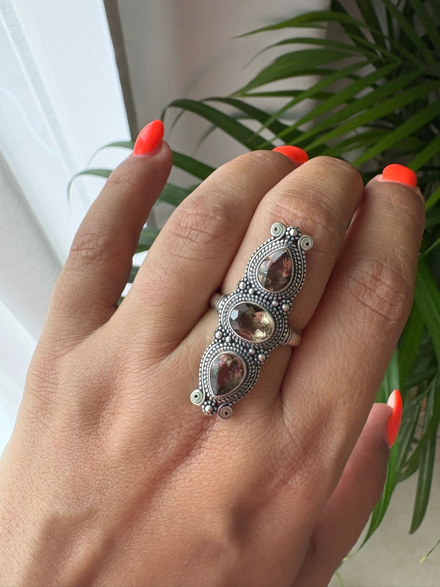 Root yourself in protective earth energy with this enchanting Smoky Quartz ring. Handcrafted in S925 sterling silver, it features three beautifully faceted smoky gems, surrounded by ornate, detailed silverwork. Its adjustable band hugs your finger like a grounding talisman.