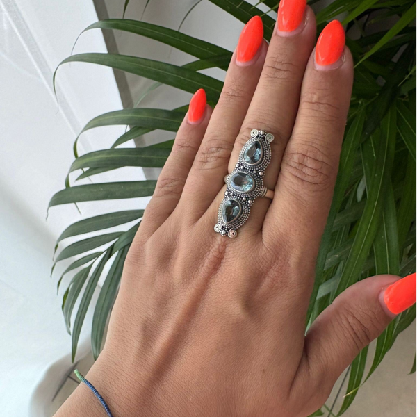 Dive deep into your inner ocean with this stunning London Blue Topaz ring. Handcrafted in S925 sterling silver, it features three faceted stones set in intricate, vintage-inspired silverwork. The adjustable band ensures a perfect fit, wrapping your finger in watery elegance.