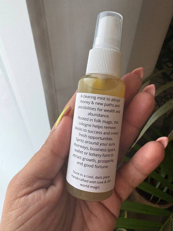 A vibrant ritual spray designed to open the roads to wealth, prosperity, success, and good fortune. Its energizing scent clears stagnant energy, invites good fortune, and aligns your spirit with the flow of abundance. Use to cleanse your aura, refresh your sacred space, or charge your prosperity tools.