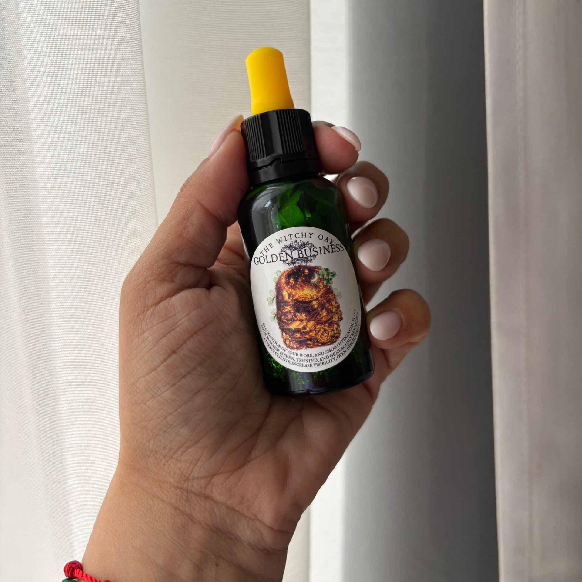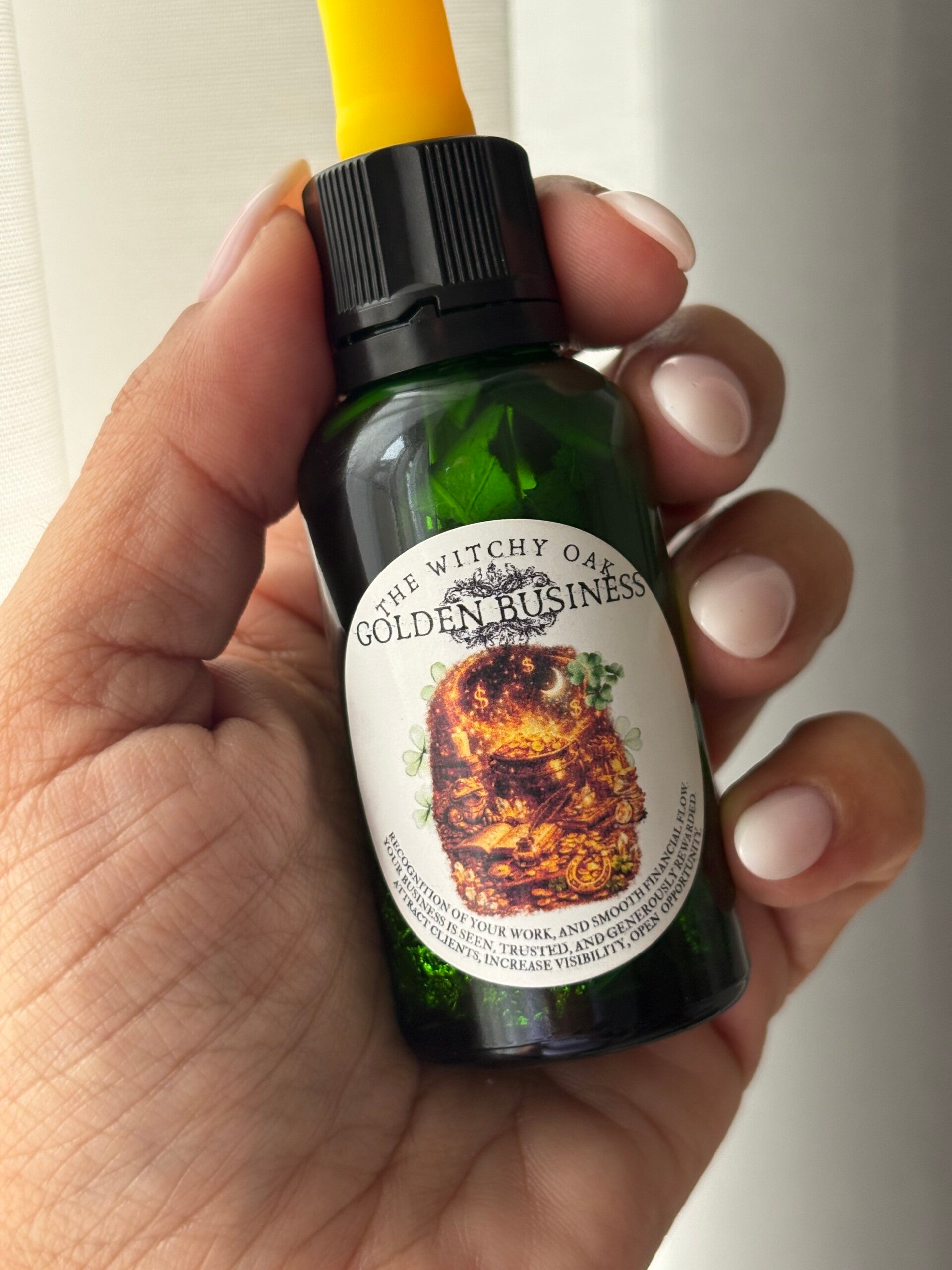 Golden Business is a ritual spell oil created to support visibility, client attraction, and steady financial momentum in your work. It is crafted for makers, practitioners, entrepreneurs, and creatives who want their offerings to be recognized, valued, and chosen with confidence.