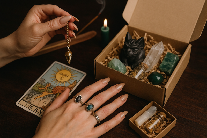 Every box is a unique experience, filled with ritual tools, crystals, oils, candles, herbs, and special mystery items chosen to match its theme.